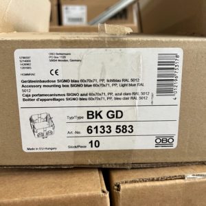 Puszka instalacyjna OBO BK GD, 1-modułowa, do kanałów SIGNO BK/BA/BS, wymiary 71×70×60 mm, bezhalogenowa, montaż śrubowy, z trageringiem.